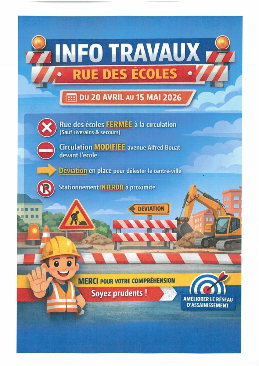 INFO TRAVAUX "RUE DES ECOLES" A COMPTER DE LUNDI 20 AVRIL