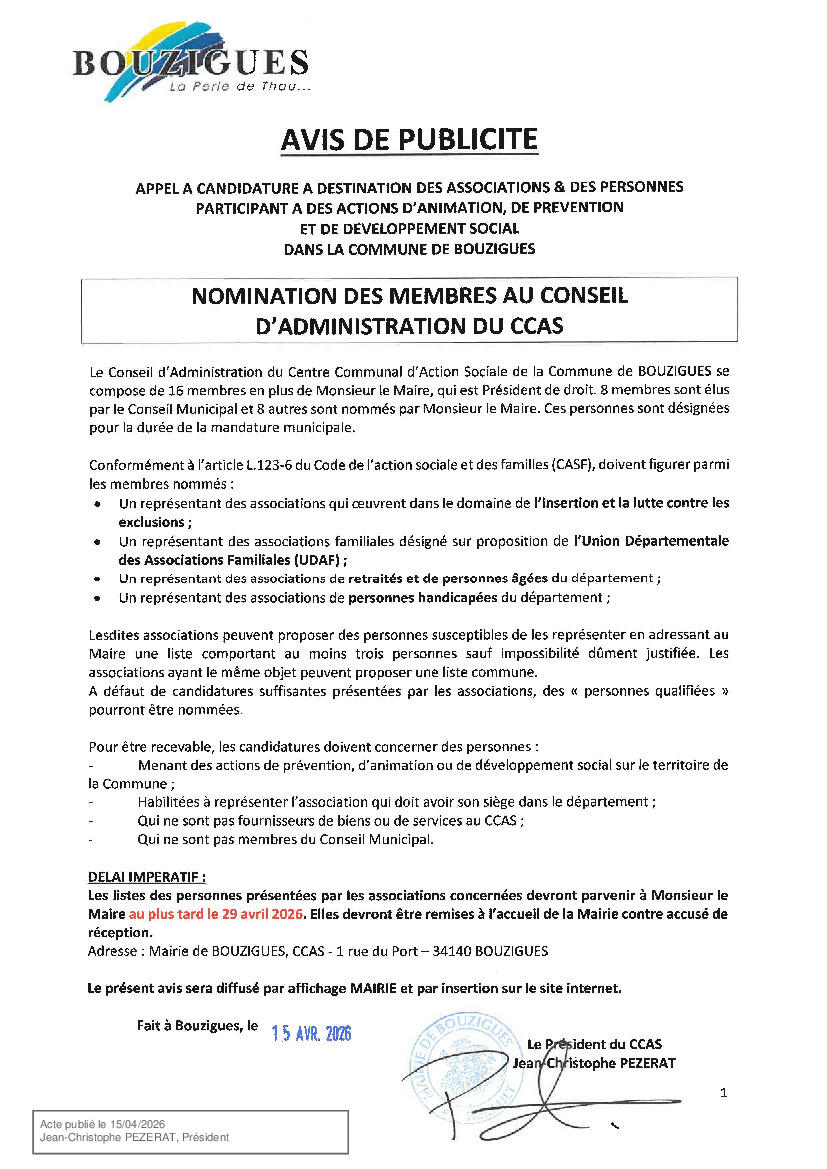 La commune lance un appel à candidatures pour renouveler les membres du conseil d’administration du Centre Communal d’Action Sociale (CCAS) issus de la société civile.