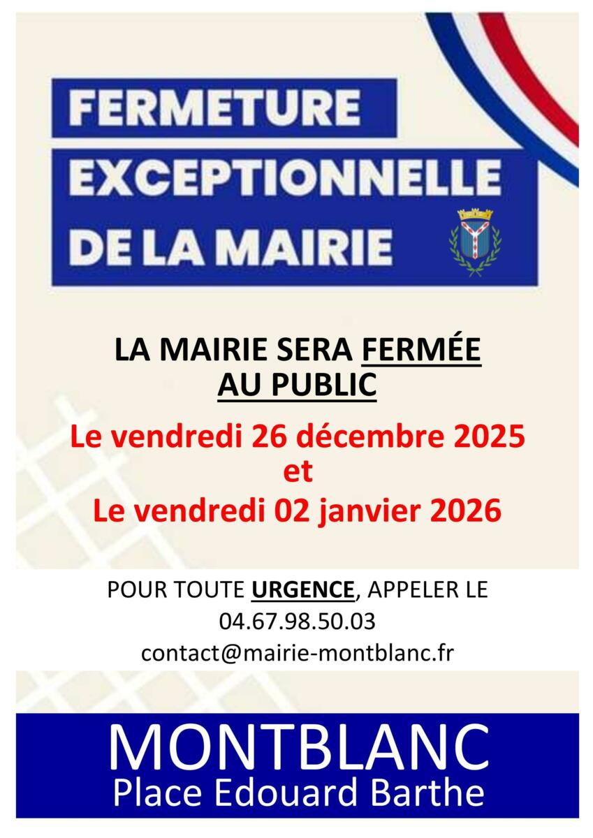 FERMETURE EXCEPTIONNELLE DE LA MAIRIE LE 26 DEC ET LE 2 JANV