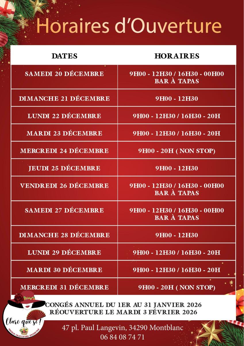 Horaires pendant les fêtes de fin d’année chez Claro Que Si Montblanc. Pour vous accompagner tout au long des fêtes et préparer vos repas en toute sérénité, voici mes horaires durant cette période festive. Je reste ouverte pour vos fruits et légumes frais, vos plateaux de fruits, vos fruits de mer et toutes vos envies gourmandes de fin d’année.