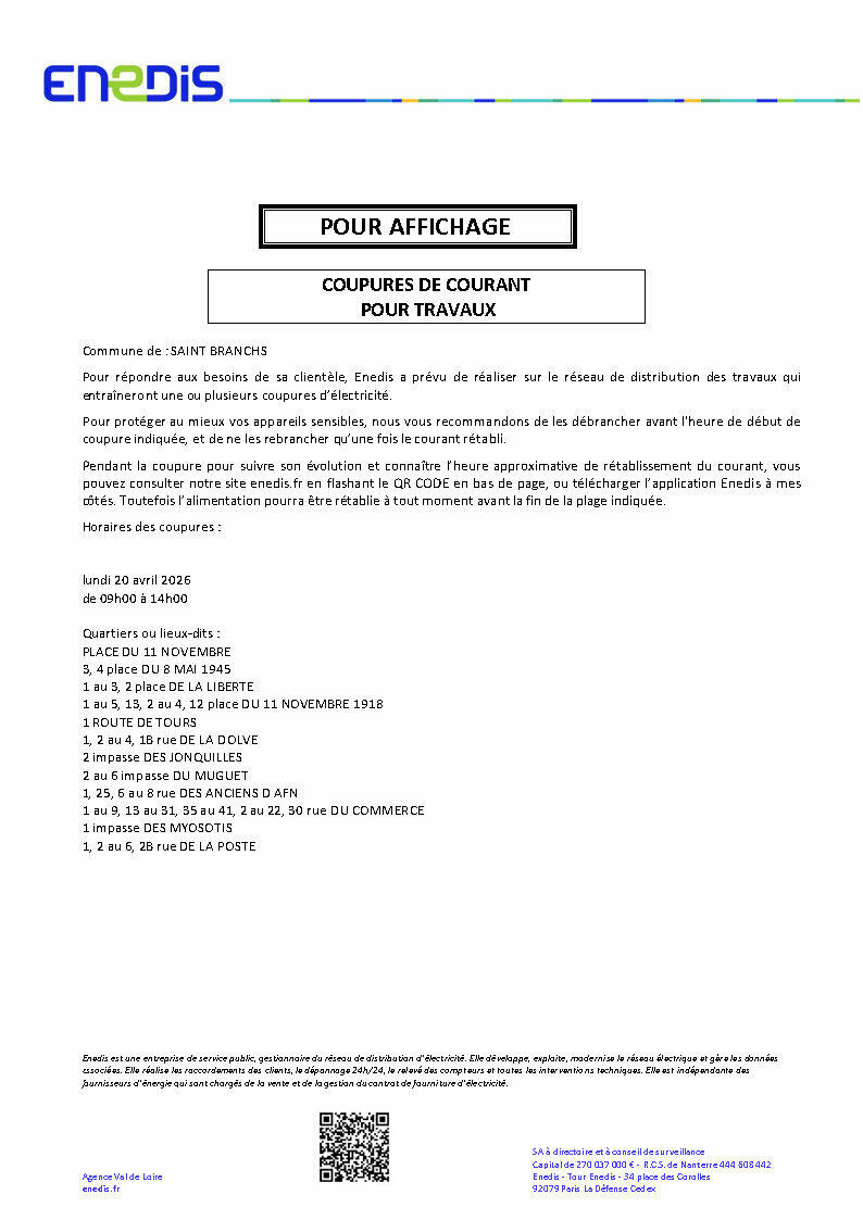 Enedis nous informe que des travaux sur le réseau électrique entraîneront une ou plusieurs coupures d'électricité sur la commune de Saint-Branchs.