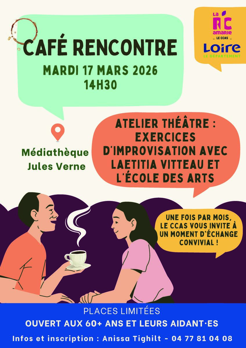 ☕ Plus de 60 ans ? Le Café rencontre vous invite tous les mois à venir partager un moment de convivialité. Le prochain aura lieu le 17 mars à la médiathèque, à 14h30, pour un atelier théâtre.