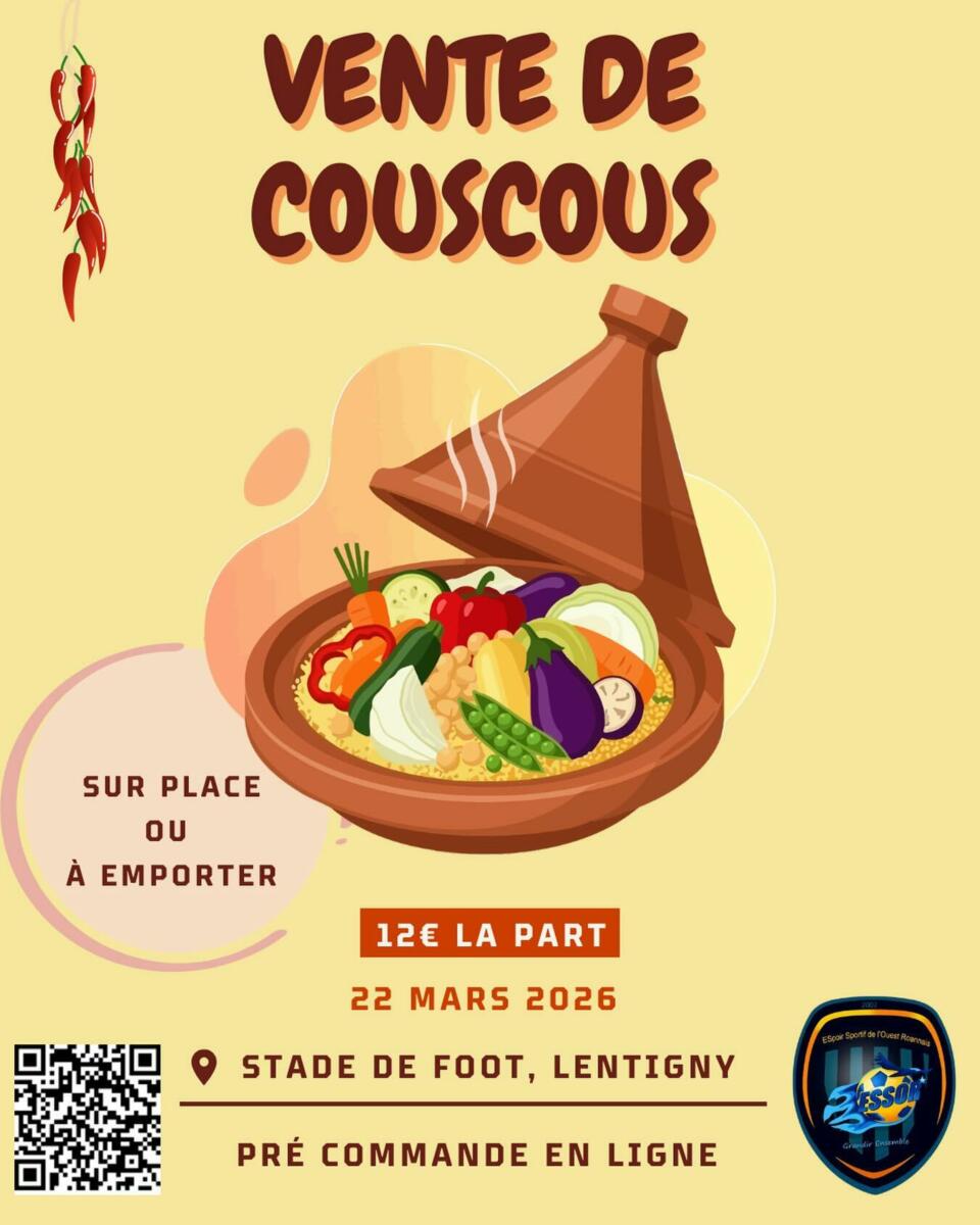 "Rendez-vous dimanche 22 mars au stade de Lentigny pour notre vente de couscous ! Vous pouvez venir manger sur place ou à emporter.