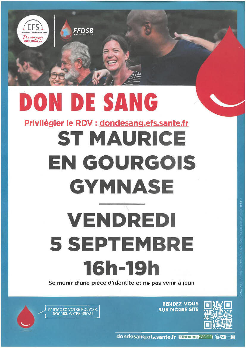 La prochaine collecte de sang aura lieu dans notre commune le jeudi 5 septembre, de 16h00 à 19h00.
