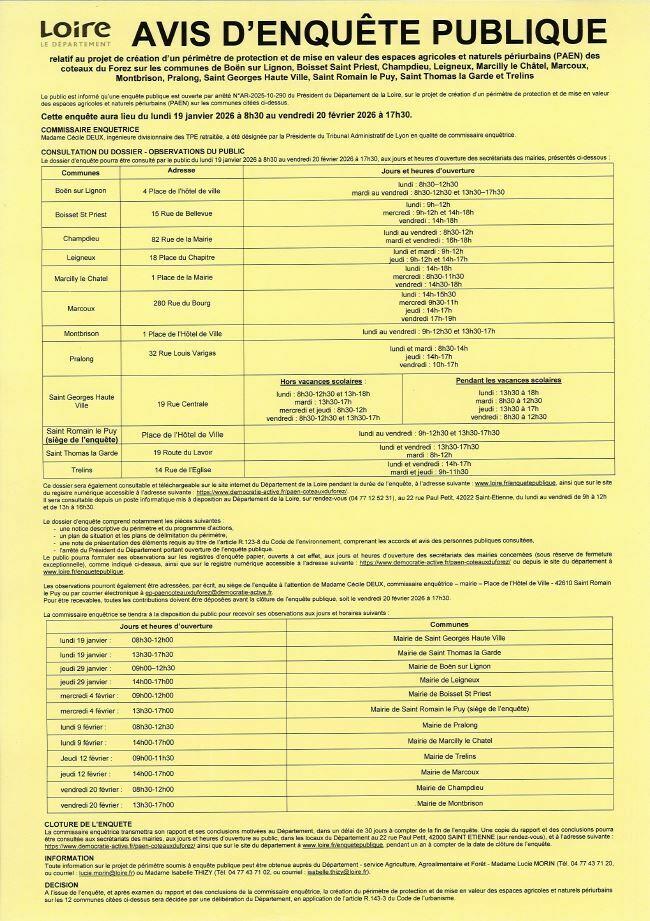Une enquête publique sur le projet de création d’un périmètre de protection et de mise en valeur des espaces agricoles et naturels périurbains (PAEN) des côteaux du Forez sur les communes de :Boen-sur-Lignon, Boisset-saint-Priest, Champdieu, Leigneux, Marcilly-le-Chatel, Marcoux, Montbrison, Pralong, Saint Georges-Haute-Ville, Saint-Romain-le-Puy, Saint-Thomas-la-garde, Trelins