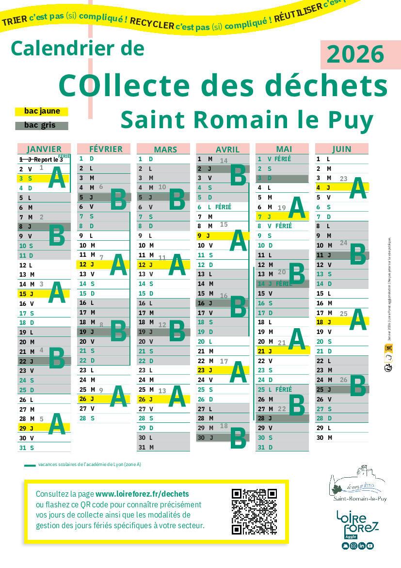 Le calendrier de collecte de 2026 est disponible ci-dessous, sur le site internet de la mairie, et en version papier à l'accueil de la mairie.