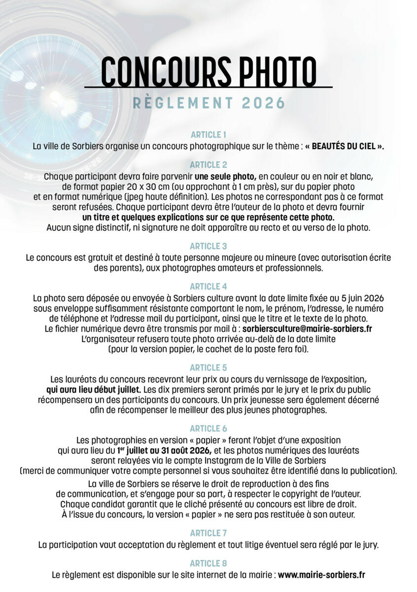 Le concours photo organisé par Sorbiers Culture fait son retour en 2026. Le thème choisi pour cette année est "Beautés du ciel".