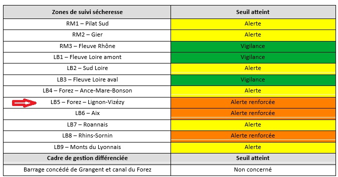 Suite aux précipitations du 28 août et au vu des éléments disponibles au 1er septembre qui font état d’une amélioration de la situation, Mme la préfète de la Loire a pris la décision en application de l’arrêté-cadre DT -25-0556 du 02 septembre 2025, de faire évoluer les zones d’alerte ainsi :