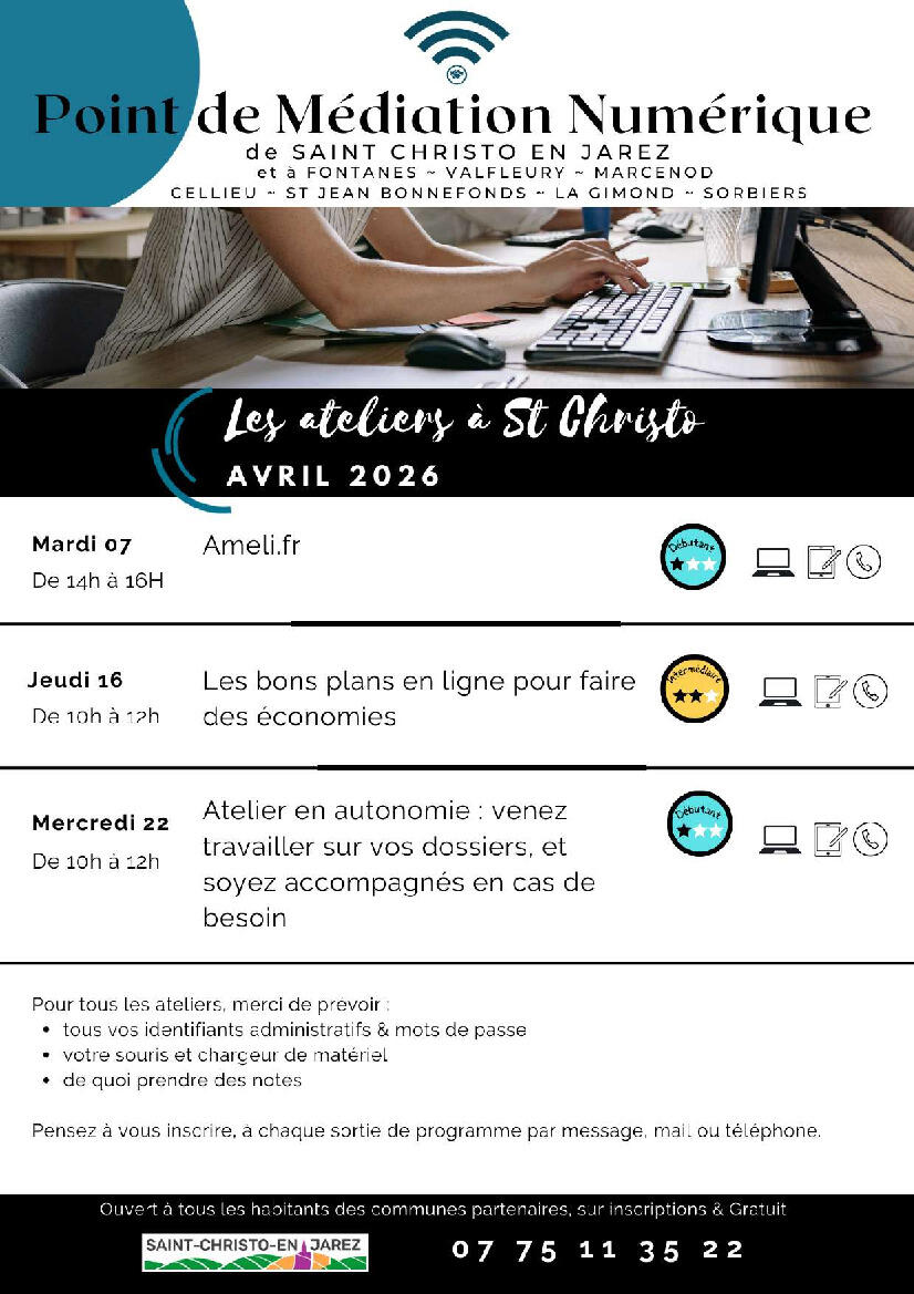 Ateliers du mois d'avril 30/03/2026 Ateliers du mois d'avril Source : Mairie de Saint-Christo-en-Jarez