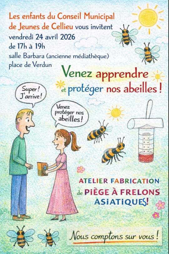 Les enfants du Conseil Municipal de Cellieu vous invitent le vendredi 24 Avril de 17h00 à 19h00  pour apprendre et protéger nos abeilles.