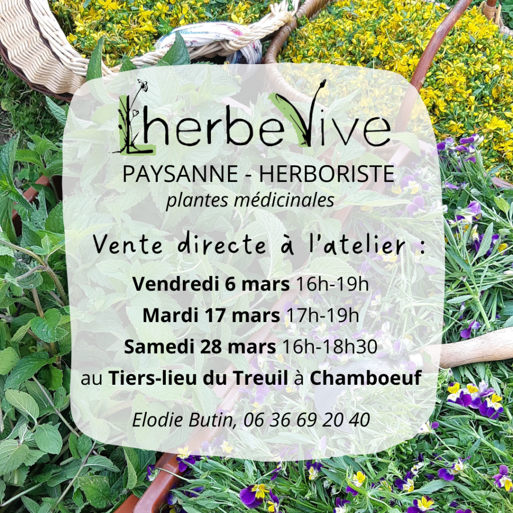 L'herbe Vive Paysanne - Herboriste 26/03/2026 Vente directe - plantes médicinales au Tiers-lieu du Treuil à Chamboeuf - le 6 mars de 16 h à 19 h - le 17 mars de 17 h à 19 h - le 28 mars de 16 h à 18 h 30