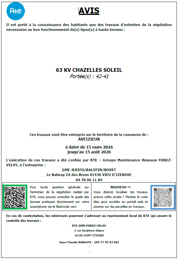 Il est porté à la connaissance des habitants que des travaux d'entretien de la végétation nécessaires au bon fonctionnement de(s) ligne(s) à haute tension :
