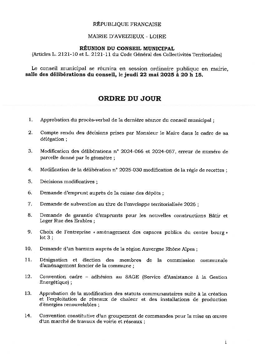 Le conseil municipal se réunira en session ordinaire publique en mairie, salle des délibérations du conseil, le jeudi 22 mai 2025 à 20 h 15.