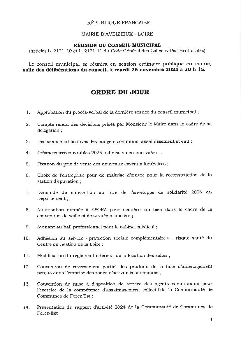 Le conseil municipal se réunira en session ordinaire publique en mairie, salle des délibérations du conseil, le mardi 25 novembre 2025 à 20h15