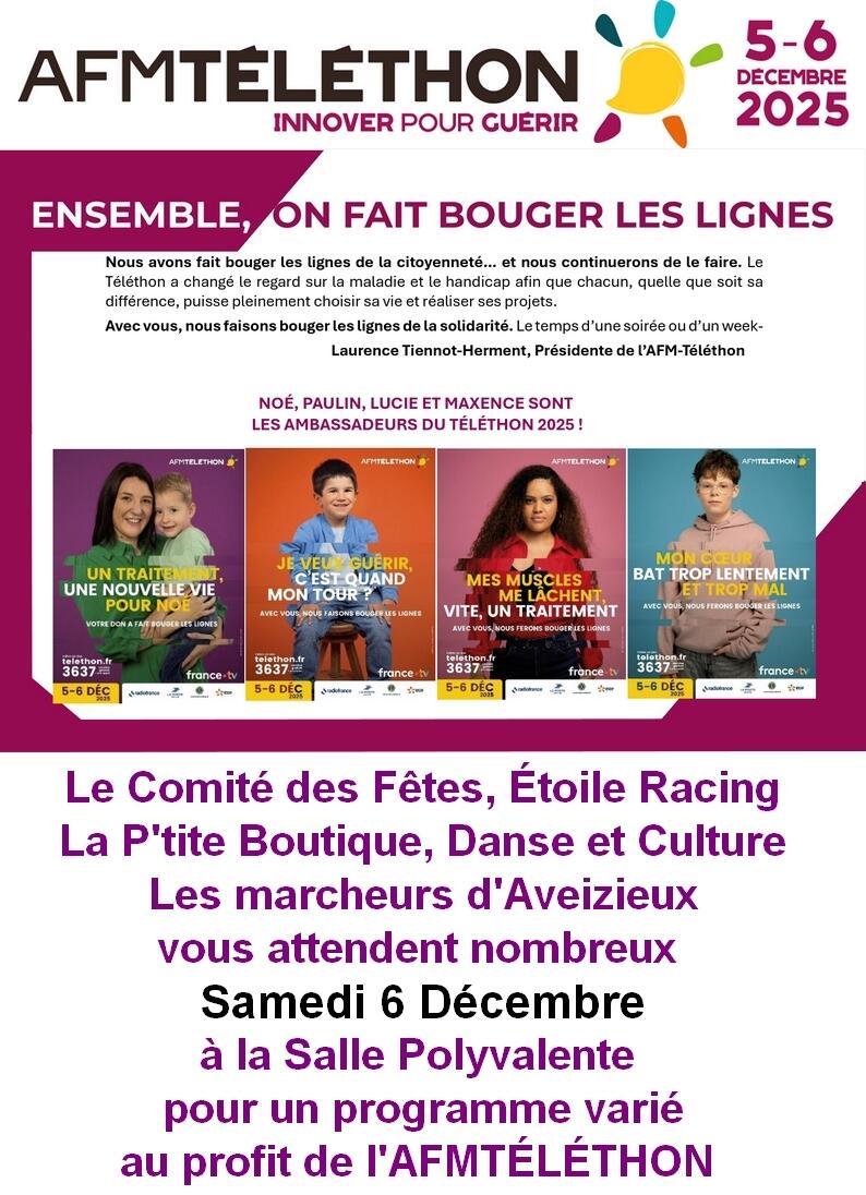 Le comité des Fêtes, Etoile racing, La P'tite Boutique, Danse et Culture, Les marcheurs d'Aveizieux vous attendent nombreux Samedi 6 décembre à la salle polyvalente pour un programme varié au profit de l'AMFTÉLÉTHON