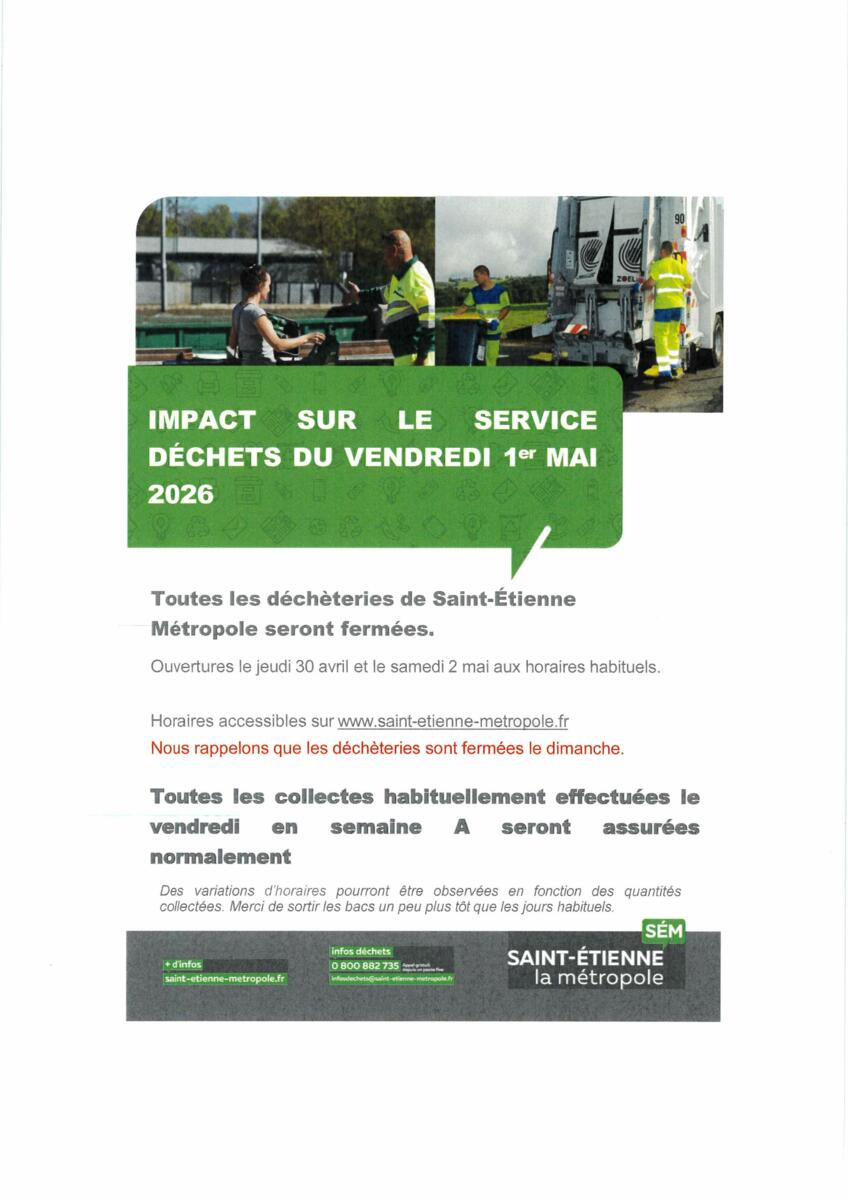 Déchetterie De Lorette - Pont Du 1Er Mai 2026 27/04/2026 La déchetterie de Lorette sera fermée le vendredi 1er mai 2026. Elle sera ouverte le jeudi 30/04 et samedi 02/05 aux horaires habituels.
