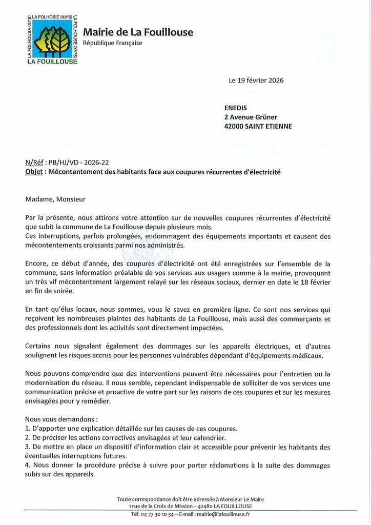 La municipalité a interpellé ENEDIS au sujet des coupures de courant à répétition sans information préalable.