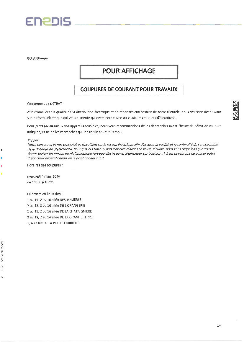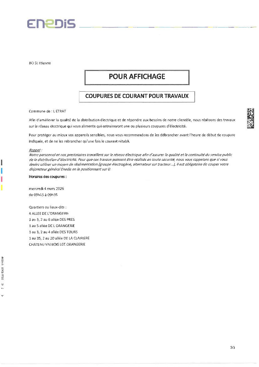 Coupures de courant pour travaux ENEDIS 27/02/2026 ENEDIS vous informe de coupures de courant pour travaux le mercredi 04 mars 2026