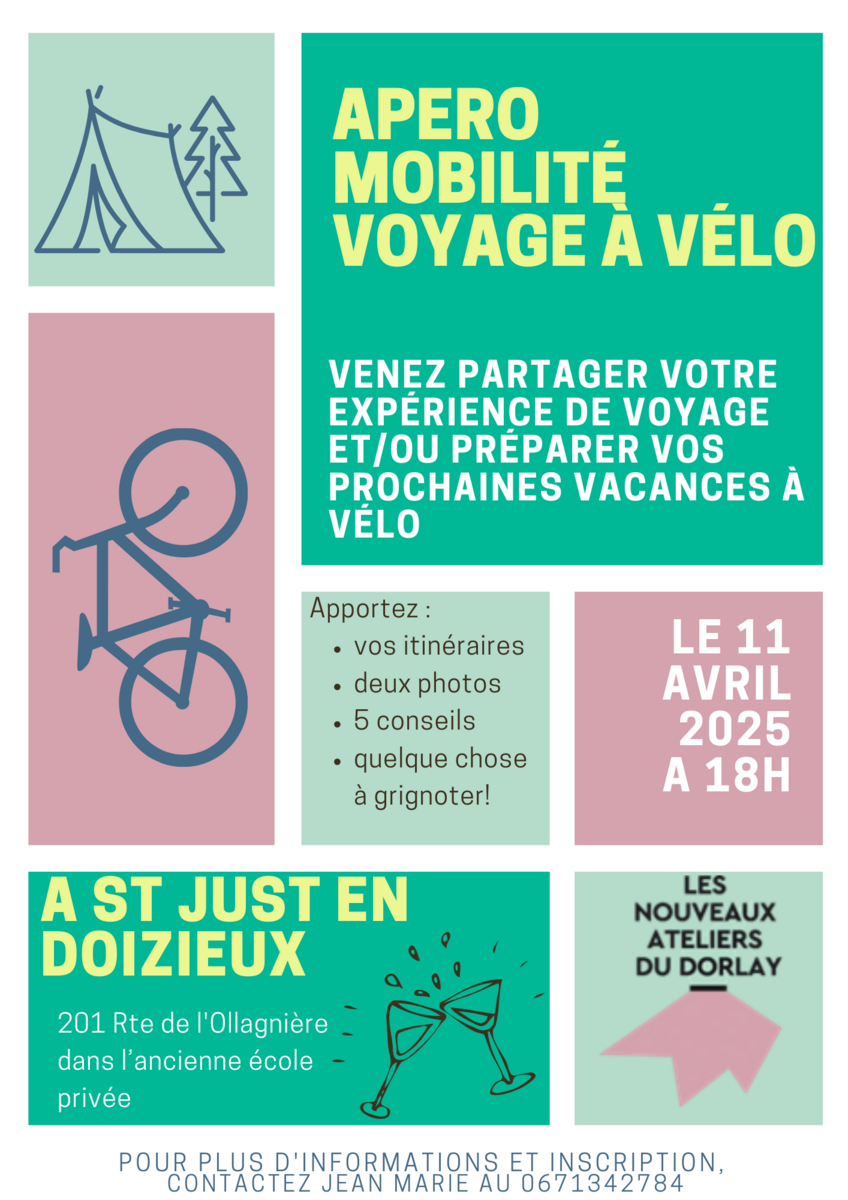 Apéro Vélo Mobilité Voyage À Vélo 04/03/2025 Venez partager votre expérience de voyage et/ou préparer vos prochaines à vacances à vélo, le 11 avril 2025 à 18h. Pour plus d'informations et inscription, contactez Jean-Marie au 06 71 34 27 84