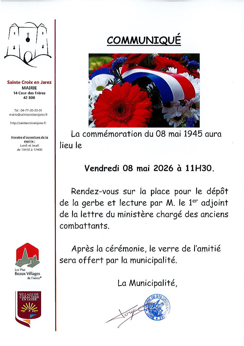 Nous vous informons que la Commémoration du 8 mai 1945 aura lieu