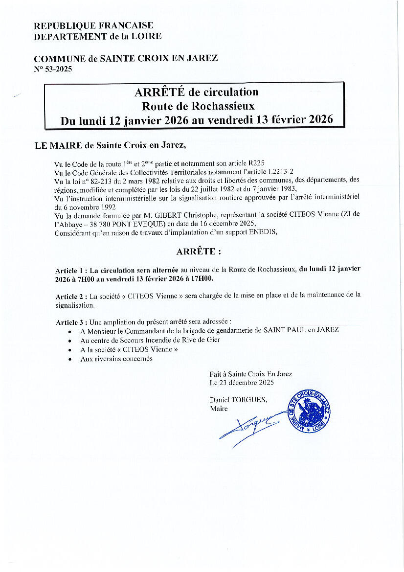 Circulation Alternée Route De Rochassieux 09/01/2026 En raison de travaux d'implantation d'un support ENEDIS, la circulation sera alternée sur la route de Rochassieux du lundi 12 janvier 2026 à 7H00 au vendredi 13 février 2026 à 17H00. Merci pour votre compréhension.
