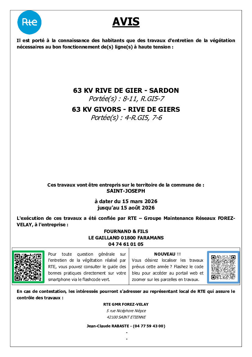 des travaux d'élagage et d'abattage vont être entrepris prochainement sur le territoire de votre commune par la Société RTE, afin d'assurer le bon fonctionnement des lignes hautes tension mais également la sécurité des personnes aux abords de ces ouvrages.