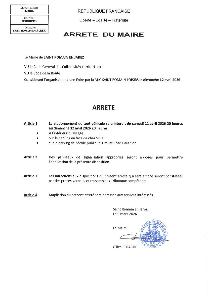 FOIRE ARTISANALE - Attention !!! 12/04/2026 Stationnement interdit Source : Mairie de Saint-Romain-en-Jarez