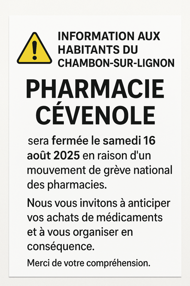 La Pharmacie Cévenole sera fermée le samedi 16 août 2025 en raison d’un mouvement de grève national des pharmacies.