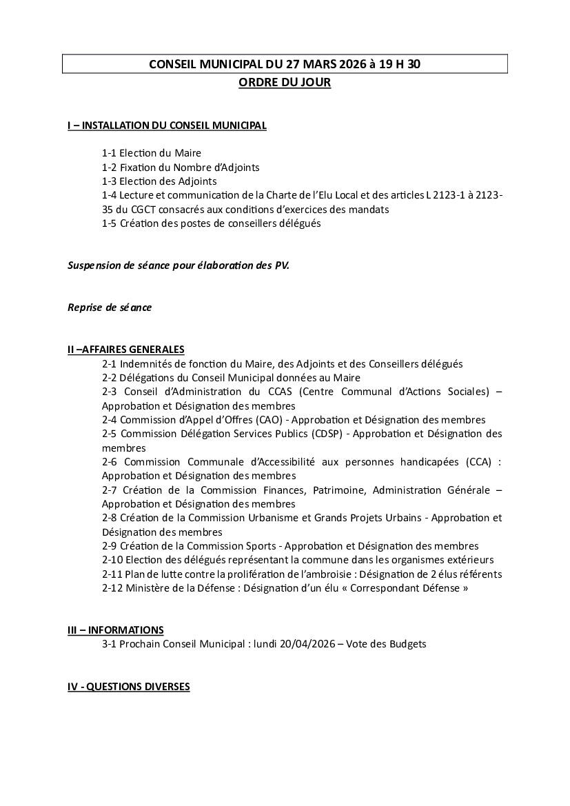 🔴 Ordre du jour Conseil Municipal d'installation - 27/03/26