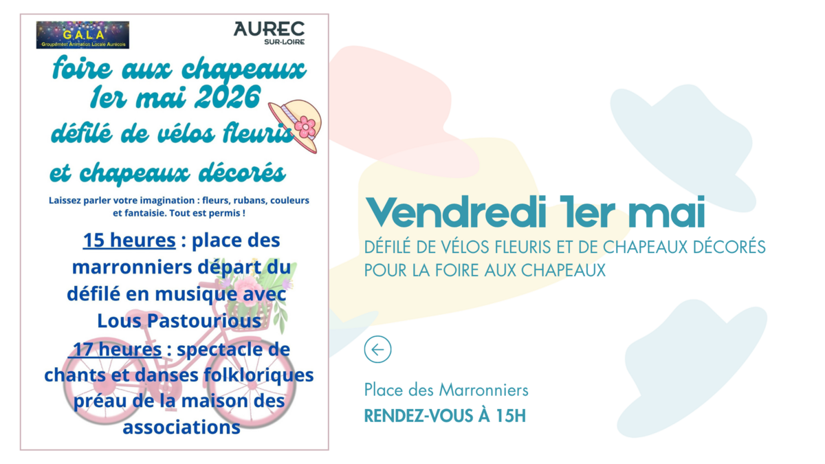 Le Comité des fêtes GALA vous propose un défilé de vélos fleuris et de chapeaux décorés. Rendez-vous à 15h, place des Marroniers 🚲🎩