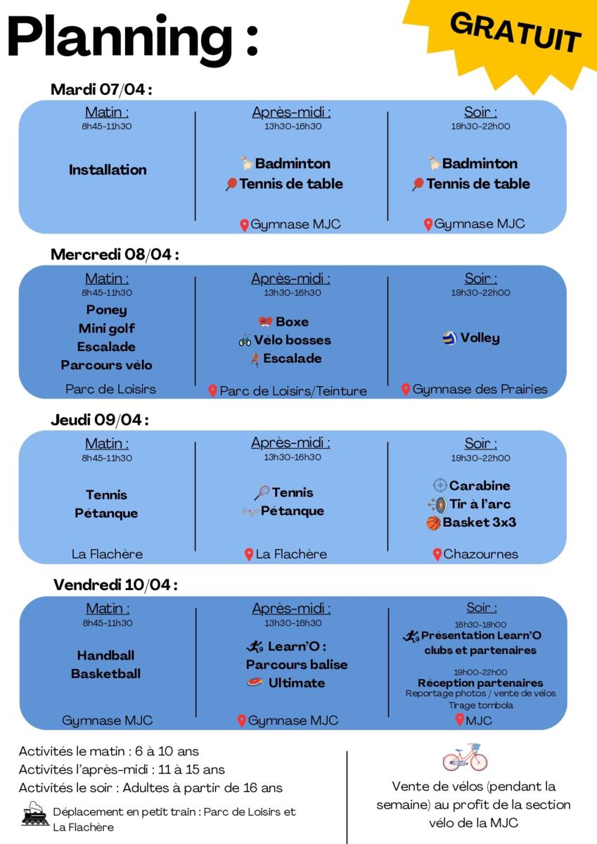 👉 Au programme : Badminton, tennis de table, tennis, basket, handball, escalade, parcours vélo / vélo bosses, tir à l’arc & carabine, boxe, volley, … et bien d’autres surprises !