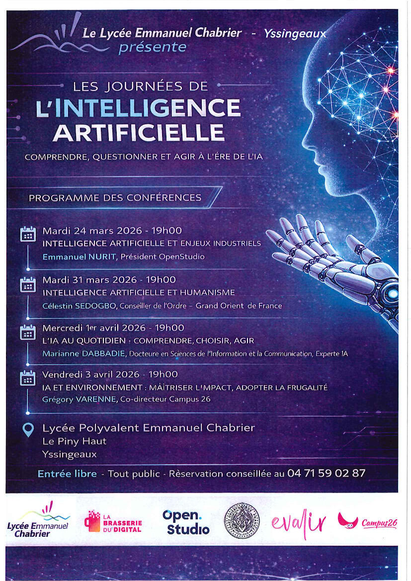 Le Lycée Emmanuel Chabrier d'Yssingeaux organise du 24 mars au 3 avril 2026, les "Journées de l'Intelligence Artificielle", pour sensibiliser élèves et parents aux enjeux scientifiques, éthiques et sociétaux de l'IA dans une approche pluridisciplinaire.