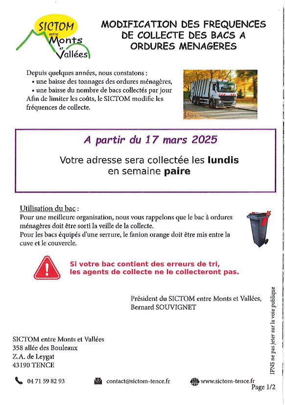 Rectificatif-Collecte du SICTOM 07/03/2025 A partir du 17 mars 2025, la collecte des ordures ménagères aura bien lieu les lundis en semaine PAIRE.