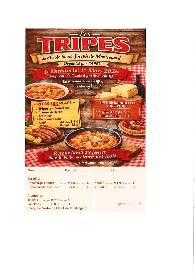 Votre mairie / Actualités / Tripes - APEL Ecole de MONTREGARD