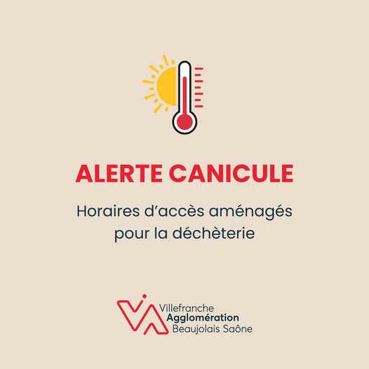 Au regard des fortes chaleurs annoncées cette semaine, la Communauté d’Agglomération Villefranche Beaujolais Saône adapte temporairement les horaires d’ouverture de la déchèterie d’Arnas.