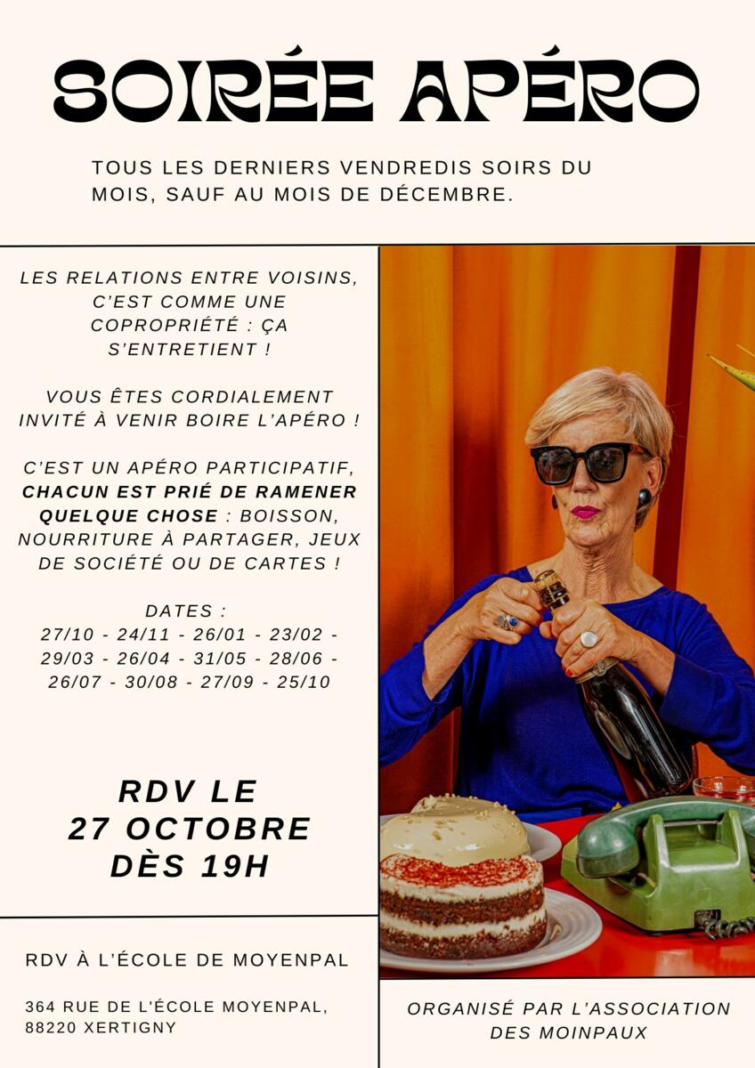➡ Soirée Apéro organisée par l'Association des Moinpaux le 24 Novembre dès 19h00 à l'Ecole de Moyenpal.