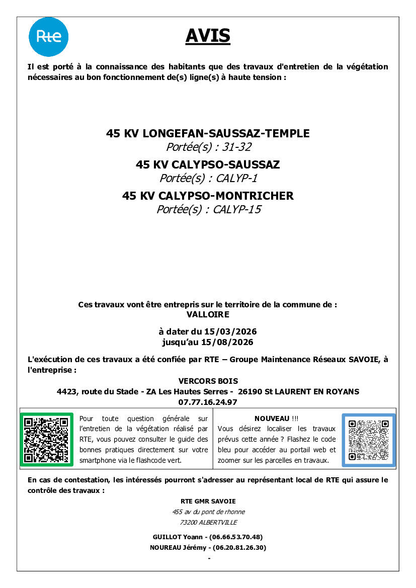 Nous avons l'honneur de vous informer que, conformément aux dispositions de l'article 12 de la Loi du 15 juin 1906 sur les distributions d'énergie et de l'arrêté du 17 mai 2001 relatif aux conditions techniques auxquelles doivent satisfaire les lignes de transport et de distribution électrique, des travaux d'élagage et d'abattage vont être entrepris prochainement sur le territoire de votre commune, afin d'assurer le bon fonctionnement des lignes hautes tension mais également la sécurité des personnes aux abords de ces ouvrages.