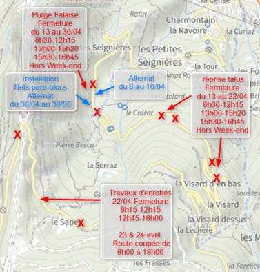 Fermeture (hors week-end) de la route secteur « La Visard » de 8h30 à 12h15 et de 13h à 16h45 avec une réouverture de 12h15 à 13h et une réouverture de 15h20 à 15h30.