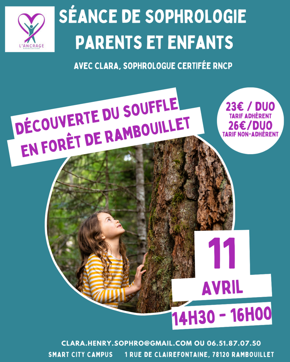 11 avr. 2026 14:30 - 16:00 11 AVRIL - ATELIER DE SOPHROLOGIE PARENT-ENFANT "Découverte du souffle en forêt" Voir plus