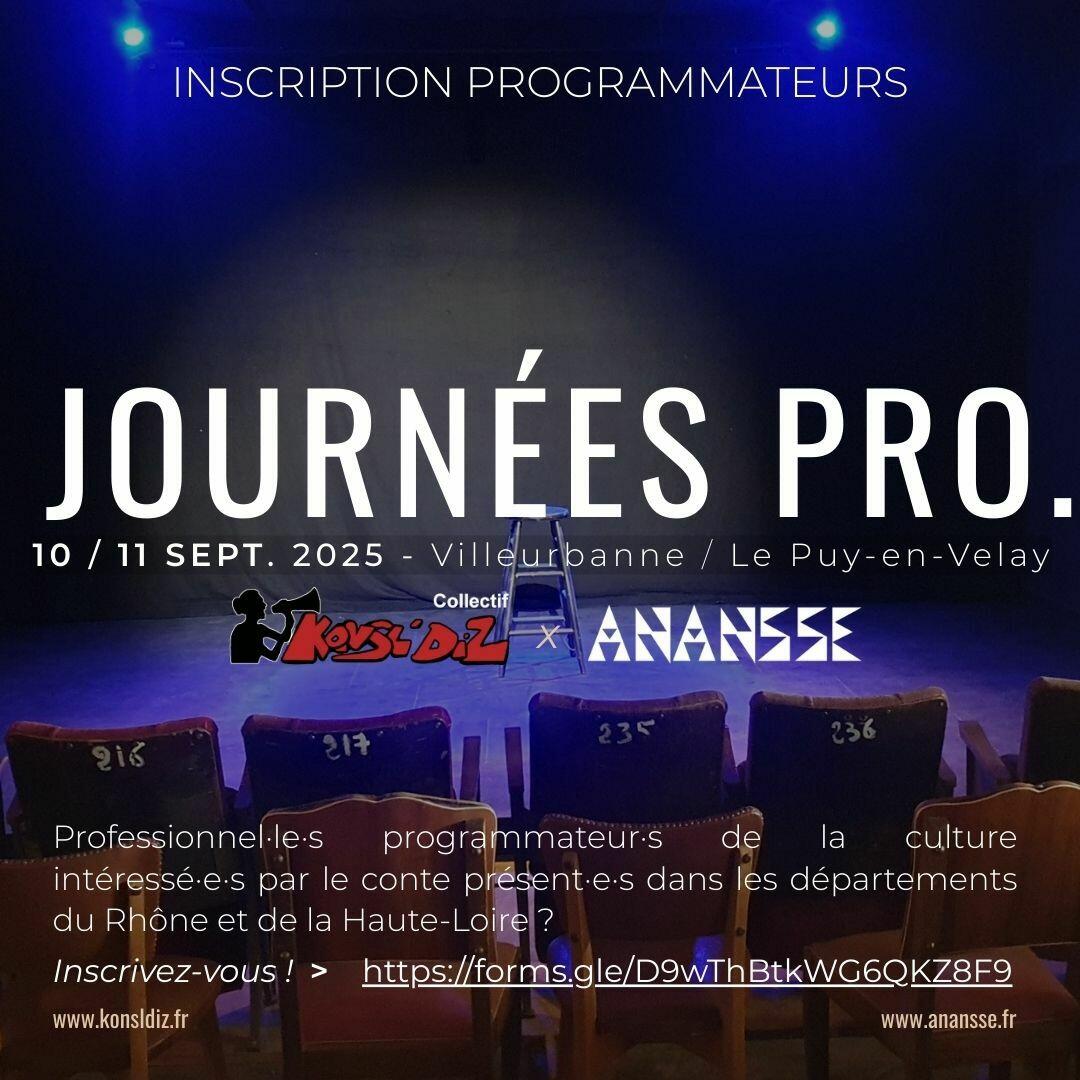 Les 10 et 11 septembre 2025, les premières Journées PRO Interdépartementales du Conte auront lieu à Villeurbanne et au Puy-en-Velay. Organisées par le collectif Konsl’Diz et Ananssé, ces journées vous invitent à découvrir 7 artistes conteur·ses d’aujourd’hui, à travers des extraits de spectacles d'une 20aine de minutes chacun.
