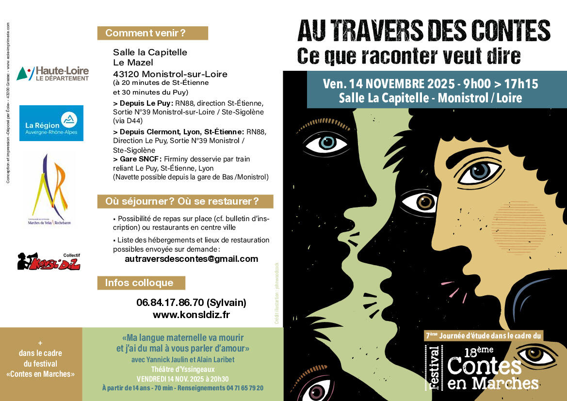En paraphrasant Pierre Bourdieu, la 6ème édition de la journée d'étude de Konsl'Diz, "Au travers des contes", interroge ce que raconter veut dire, en pensant le précieux partage relationnel possible avec les tout-petits, en dépliant l'art de conter et les bienfaits de la narration. D'horizons divers, les intervenants attendus expliqueront pourquoi il est nécessaire de raconter des histoires, ce qu'elles disent de la langue, des conteurs/conteuses, de la société (d'ici ou d'ailleurs) avec les interventions de Yannick jaulin, Gilles Bourlot, Joelle Turin, et Cecile Leguy... [programme en PJ].