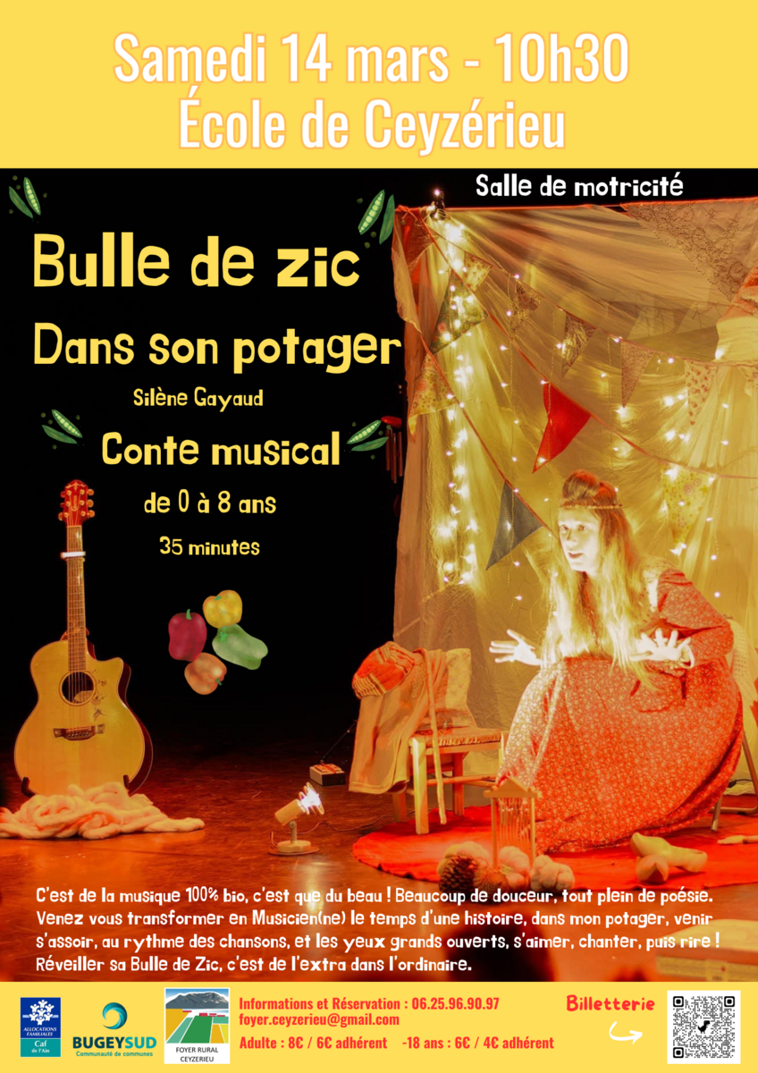 La communauté de communes Bugey-Sud soutient le spectacle « Bulle de Zic – Dans son potager », le samedi 14 mars 2026 à 10h30 à l’école de Ceyzérieu (salle de motricité).