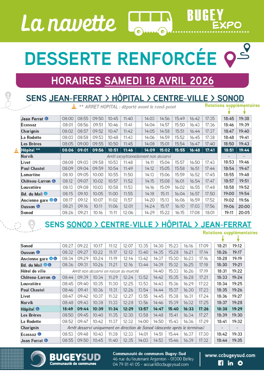 Afin de desservir le Salon Bugey Expo vendredi 17 avril et samedi 18 avril 2026, la communauté de communes Bugey-Sud ajoute des rotations supplémentaires à la Navette.
