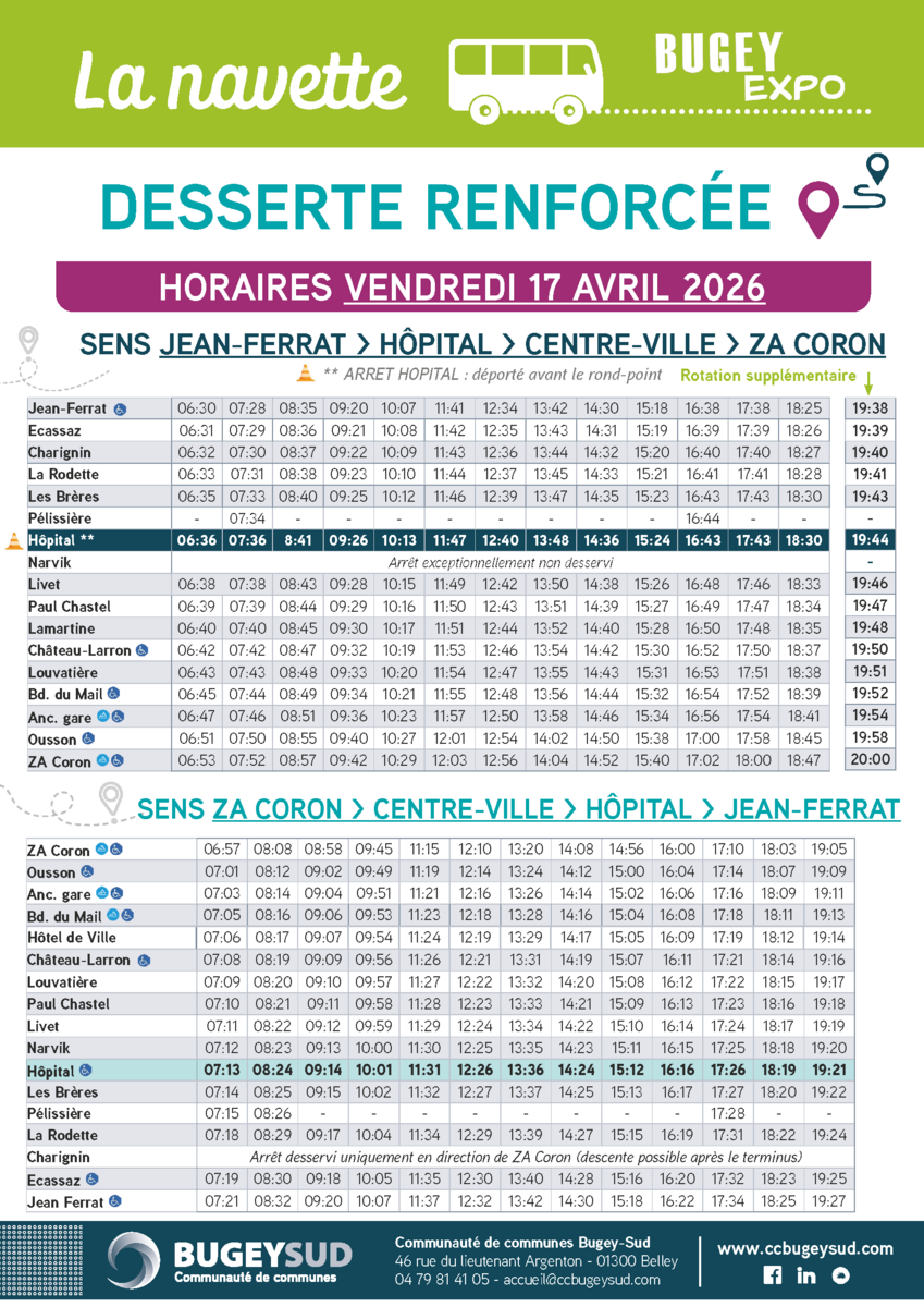 Afin de desservir le Salon Bugey Expo vendredi 17 avril et samedi 18 avril 2026, la communauté de communes Bugey-Sud ajoute des rotations supplémentaires à la Navette.