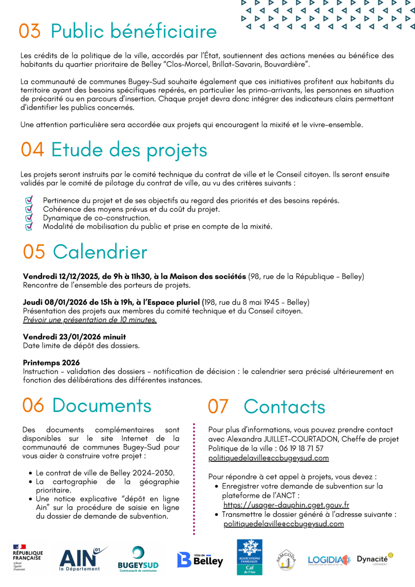 - Jeudi 08/01/2026 (15h–19h) – Espace Pluriel (Belley) ️: Présentation des projets au comité technique et au Conseil citoyen (10 minutes par porteur)