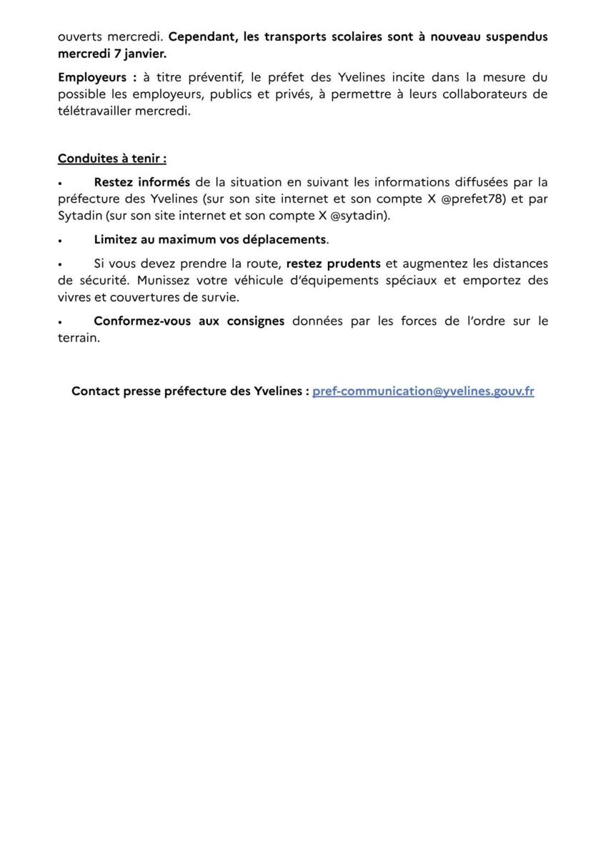 • Suivez l’évolution de la situation sur le site internet de la préfecture des Yvelines (www.yvelines.gouv.fr) et celui de sytadin (www.sytadin.fr)