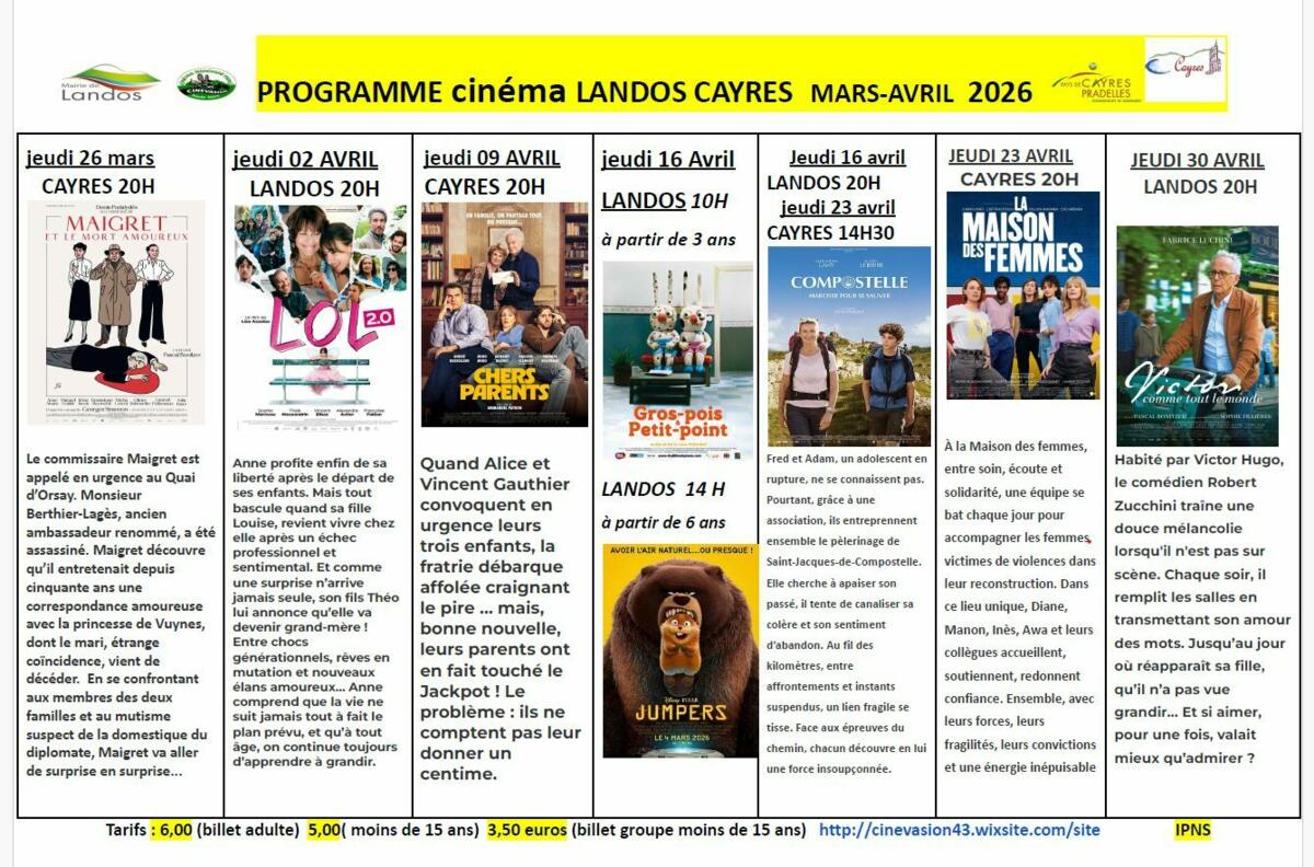 Par ailleurs, nous souhaitons rappeler que le reste de l’année, l’association Cinévasion assure une présence régulière sur le territoire, notamment sur les communes de Landos et de Cayres. Cette action est rendue possible grâce à l’engagement de bénévoles investis, ayant à cœur de promouvoir et de faire vivre le cinéma au plus près des habitants.