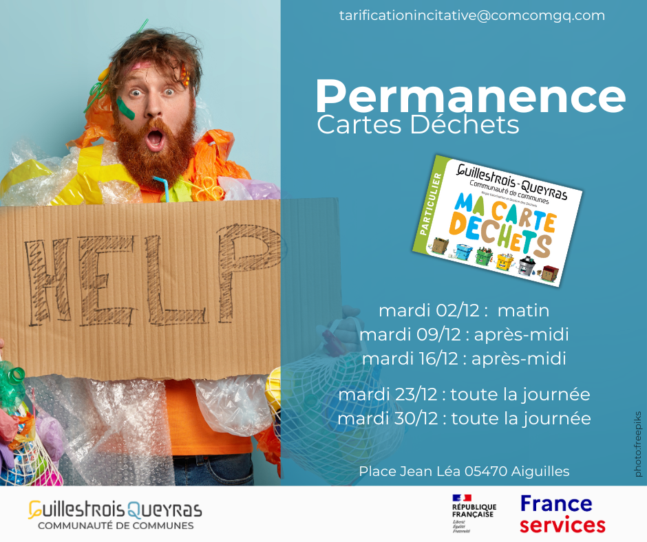 Permanence Cartes Dechets aujourd'hui 30/12/2025 Gratuit, sans rendez-vous. De 9h30 à 12h30 et de 13h30 à 16h30. Source : France Services Queyras