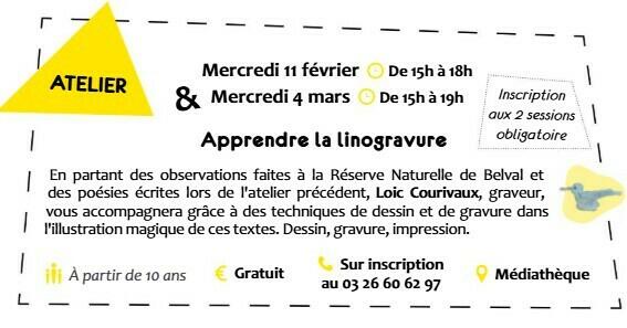 En partant des observations faites à la Réserve Naturelle de Belval et des poésies écrites lors de l'atelier précédent, Loic Courivaux, graveur, vous accompagnera grâce à des techniques de dessin et de gravure dans l'illustration magique de ces textes. Dessin, gravure, impression.