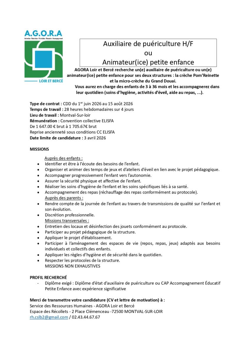 AGORA Loir et Bercé recrute pour ses structures « Pom’Reinette » et « Le Grand Douai » à Montval-Sur-Loir ! 🌟